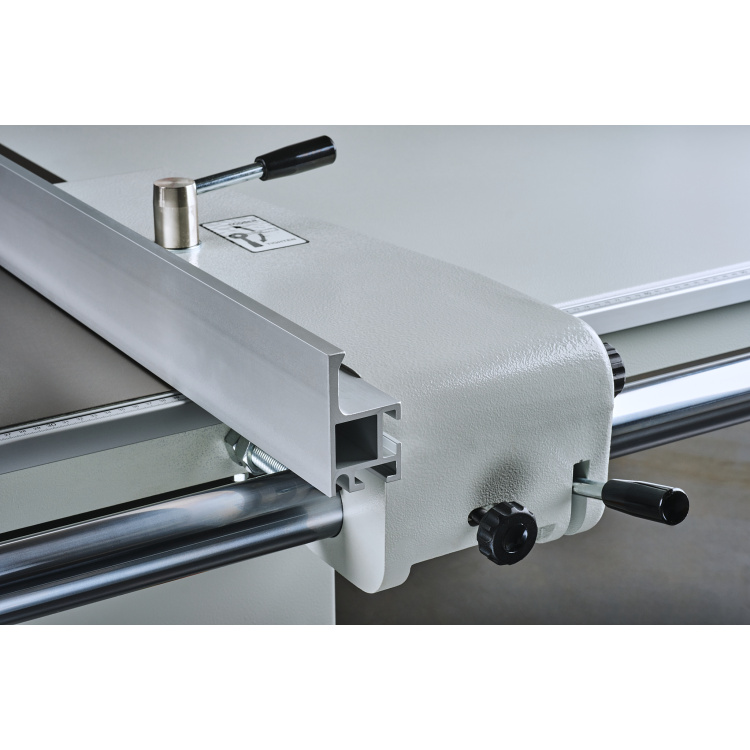 Dostatečně velký výložník, který lze zafixovat v každé poloze v délce pojezdového stolu poskytuje možnost uchycení hlavního úhlovacího pravítka jak pro řez před pravítkem, tak i za pravítkem.
