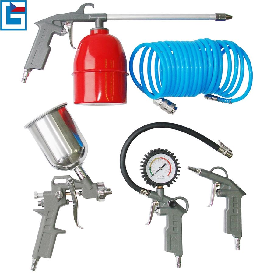 Složení sady: stříkací pistole s vrchní nádobkou, hustilka pneumatik, ofukovací pistole, spirálová hadice.