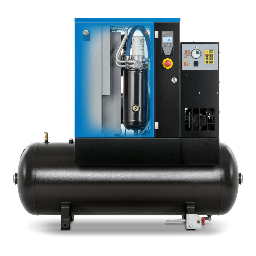 Komfortní malý šroubový kompresor s převodem pomocí klínových řemenů. Model s příkonem motoru 4 kW v praktickém provedení s tlakovou nádobou a kondenzační sušičkou pro úsporu instalačního prostoru. Stroj se šroubovým blokem C43 nejnovější generace nabízí vysokou účinnost stlačování s výkonem 516 l/min a následující standardní vybavení: